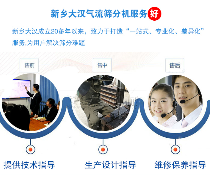 新鄉(xiāng)大漢成立20多年以來(lái),致力于打造“一站式、專業(yè)化、差異化”服務(wù),免費(fèi)對(duì)用戶進(jìn)行選型指導(dǎo)和安裝、調(diào)試及后期維修服務(wù),不斷加強(qiáng)改善用戶的體驗(yàn),用戶購(gòu)買我們的設(shè)備之后,我們會(huì)定期進(jìn)行回訪調(diào)查,真實(shí)了解到每一位用戶的使用情況,以全面、細(xì)致的服務(wù)解決用戶所遇到的篩分難題。