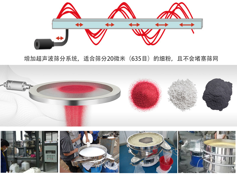 超聲波振動篩在普通篩機基礎上增加超聲波篩分裝置,超聲波振動篩振頻可達3.6萬次/秒,適合篩0-625目精細粉末,產量可提高0.5-10倍.